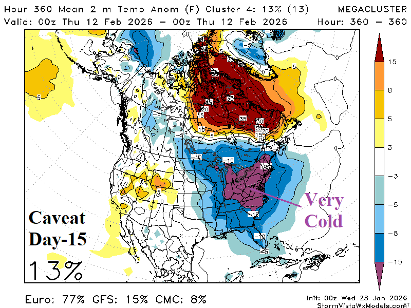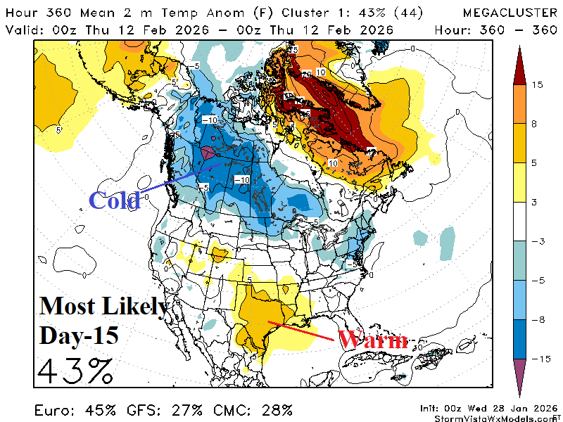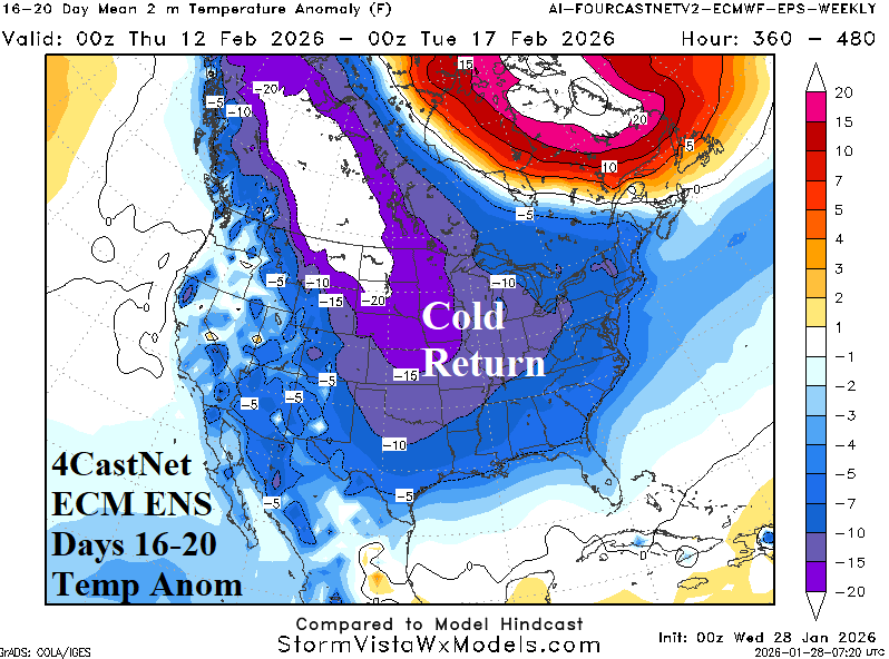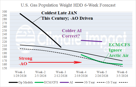 Discussion: Beginning on January 21st the arctic oscillation (AO) index shifted <-2.0. During the past week AO has averaged -4.0, very supportive of the coldest ending to January in the East U.S. this century. The 15-day forecast indicates -AO continues in the 16-day outlook averaging between -3.5 and -4.0 (Fig. 1). Extended AO forecasts indicate the -AO regime at -2.0 or stronger lasts until February 18th. The 30-day AO index is about -3.6 based on observations and projections for the 30-day period. The AO index of -3.6 is exceeded only twice as a monthly average in the 1950-2026 climatology: -4.3 (FEB-2010) and -3.8 (JAN-1977). Each month produced massive cold air for both the U.S. and Eurasia and similar with the last third of JAN-26. Despite the ongoing -AO, forecast models are generally weakening the cold, especially in the 11-15-day period in the U.S. The question is whether the easing of cold is temporary. In the 11-15-day period, an immense Greenland high-pressure block emerges supported by a strong negative (-2.5 to -3.0) North Atlantic oscillation (-NAO). While the “most likely” day-15 North America temperature anomaly forecast (43% risk) indicates gathering cold in Western Canada while Texas turns warm (Fig. 2), the “caveat” forecast (13% risk) recognizes the lingering -AO and strengthening -NAO and keeps the East very cold (Fig. 3). The other issue of concern is, will lingering -AO and strengthening -NAO enable cross-polar flow of arctic air into North America? 2-meter temperature anomaly forecast skill for the 16-20-day period ranges from a reasonable (for this timeframe) >0.5 anomaly correlation by AI 4CastNet V2 ECM ENS to near 0.3 by the traditional ECM “weeklies” (Fig. 4). The AI 4CastNet V2 ECM ENS chills Western Canada and the U.S. in the 16-20-day period (Fig. 5). Given the potential return to extreme cold which does not match operational forecasts, a recommended strategy is view the day-15 forecast by operational model runs to verify whether cross-polar arctic air is present. The day-15 ECM forecast certainly identifies redeveloping and southward shifting deep arctic air in Canada (Fig. 6). The latest U.S. gas population weight HDD forecasts reveal decelerating heating demand as February arrives (Fig. 7). However, given ongoing -AO through the week of February 19th, are the colder AI projections preferable? Keep in mind, although not perfect, AI forecasts from early January had the very cold forecast for late January easily defeating CFS/ECM outlooks.