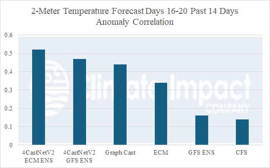 Fig. 4-5: Skill scores by forecast models for 2-meter temperature anomalies during the 16-20-day period from the last 14 days and the 16-20-day North America temperature anomaly outlook by the number 1 model (AI 4CastNet V2 ECM ENS).