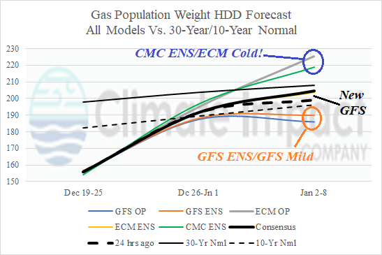 Discussion: Utilizing all operational models, forecasts are agreeable to the decelerating warm pattern to near the 10-year normal for next week. In the Jan. 2-8 period, forecast models vary widely from a milder national scenario (GFS ENS/GFS) to much colder than normal (CMC ENS/ECM). The just released GFS was near the overnight consensus.