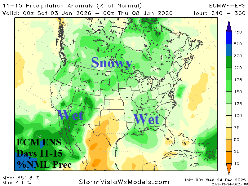 Discussion: Atmospheric river storm track shifts south and into Mexico to the Southwest U.S. while Canada is snowy in the 6-10-day period. Most of the West is stormy in the 11-15-day period with rain likely across the Southeast.