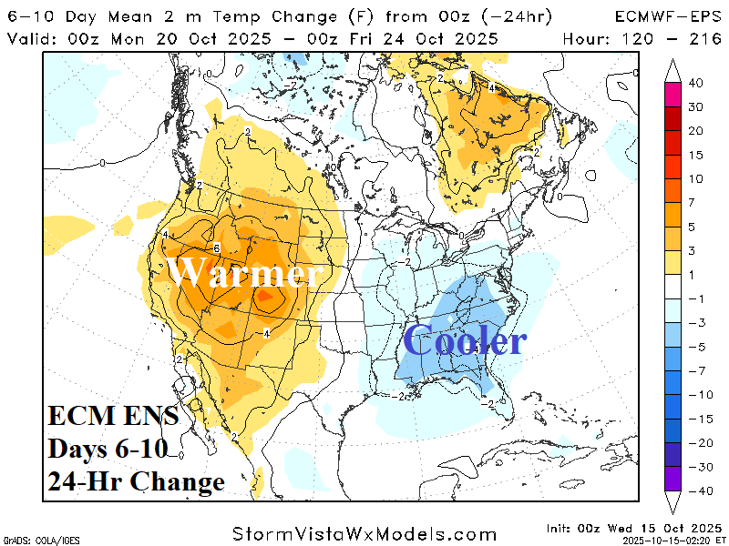Highlight: Briefly cooler East/Southeast days 6-10, otherwise warm.