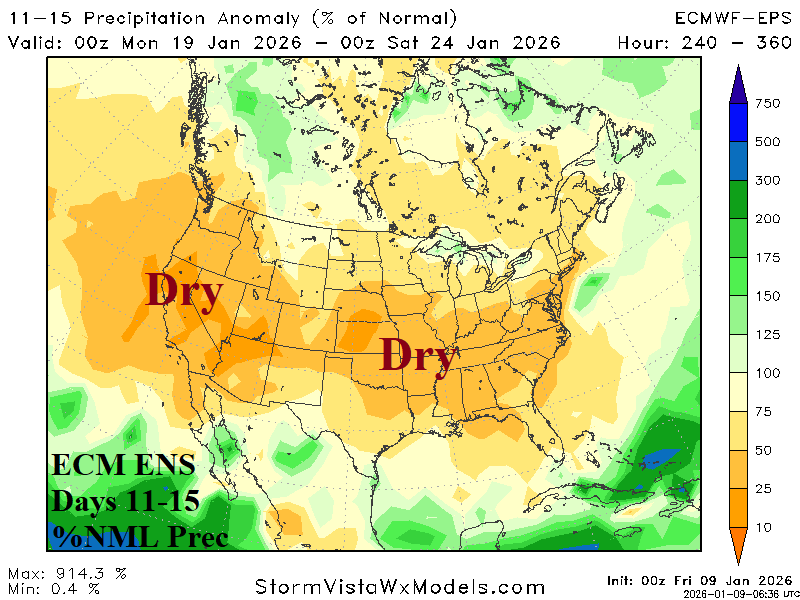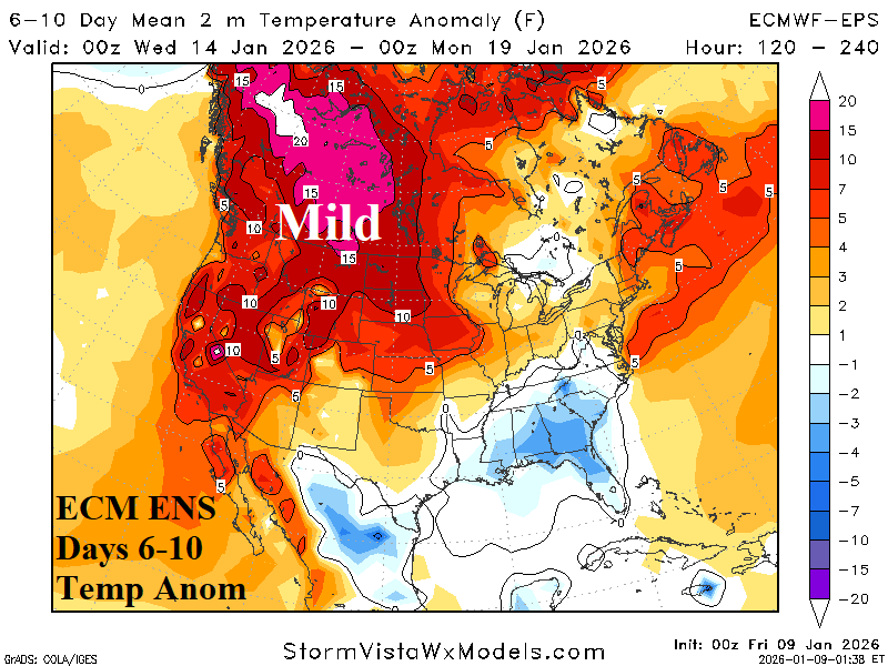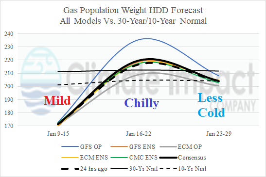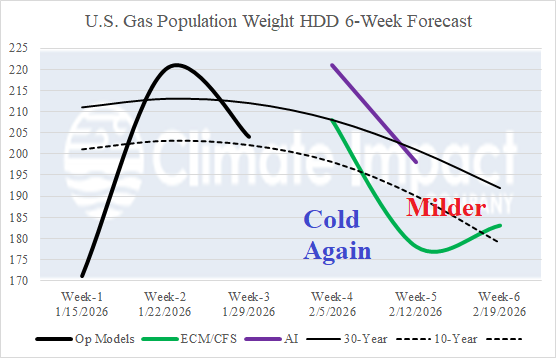 Discussion: The latest U.S. gas population weight HDD forecast identifies the mild week ahead shifting much colder Jan. 16-22 and moderating back to near normal late month. AI and CFS/ECM each indicate another cold week to start February followed by milder weather. Arctic air risk is not indicated (for the U.S.) during the period.