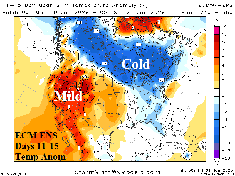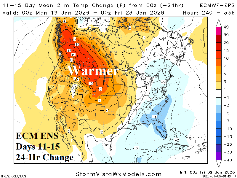 Medium-range 11-15 Day Forecast Valid January 19-23, 2026 (ECM ENS left and 24-hour change right)