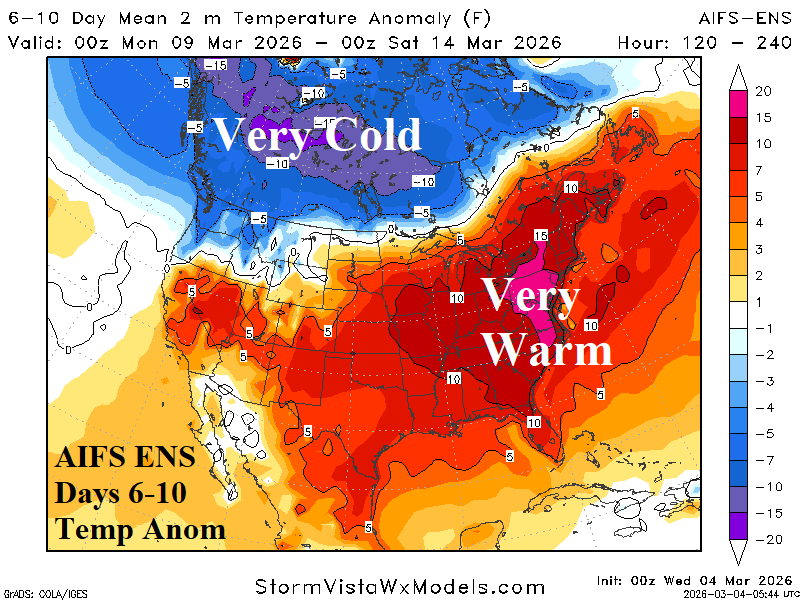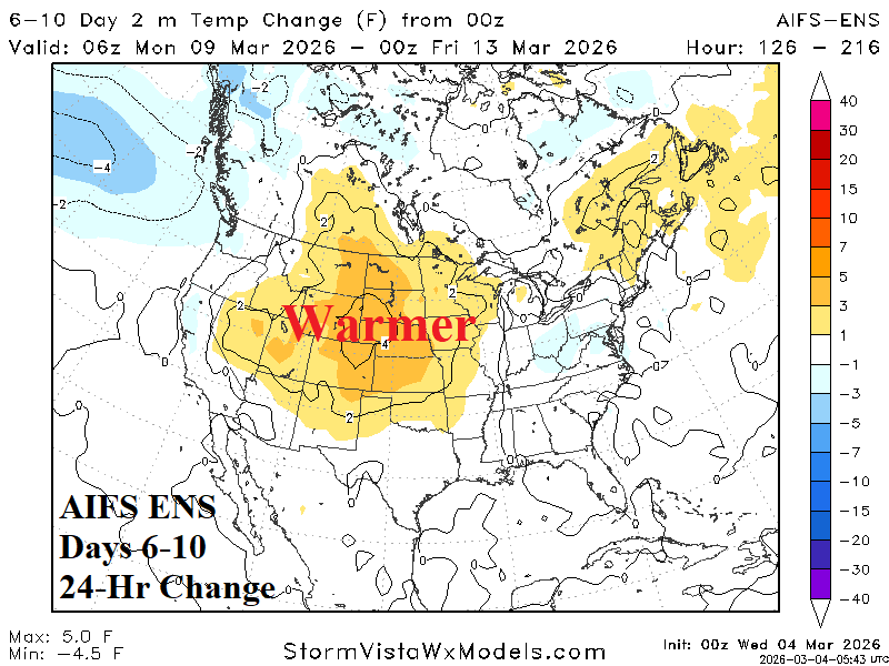Discussion: AIFS ENS is very warm in the East during the 6-10-day period while the Canadian chill is less interested in extending south into the U.S. as the West-central States shift warmer.