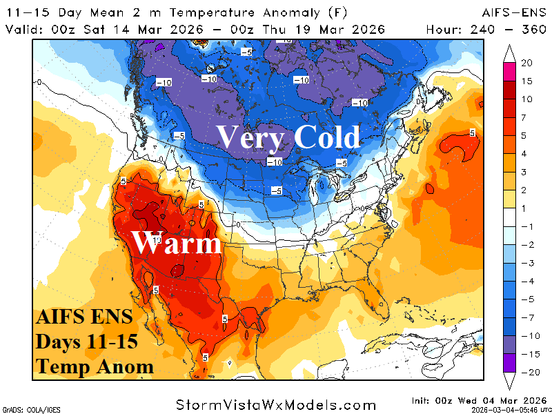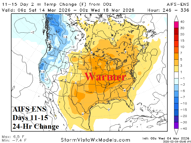 Medium-range 11-15 Day Forecast Valid March 14-18, 2026 (AIFS ENS and 24-hour change)