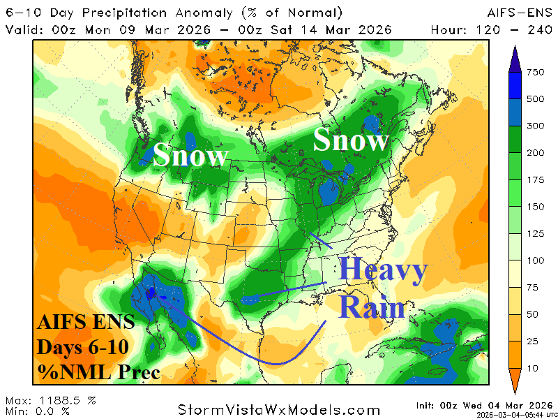 Medium-range 6-10 Day Forecast Valid March 9-13, 2026 (AIFS ENS and 24-hour change)