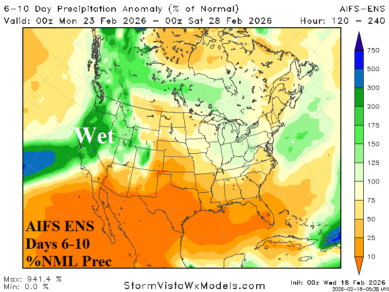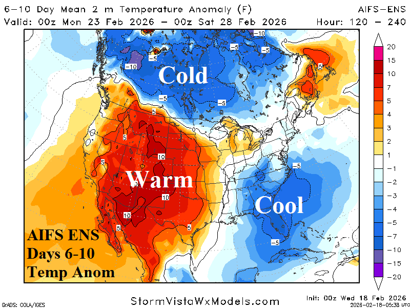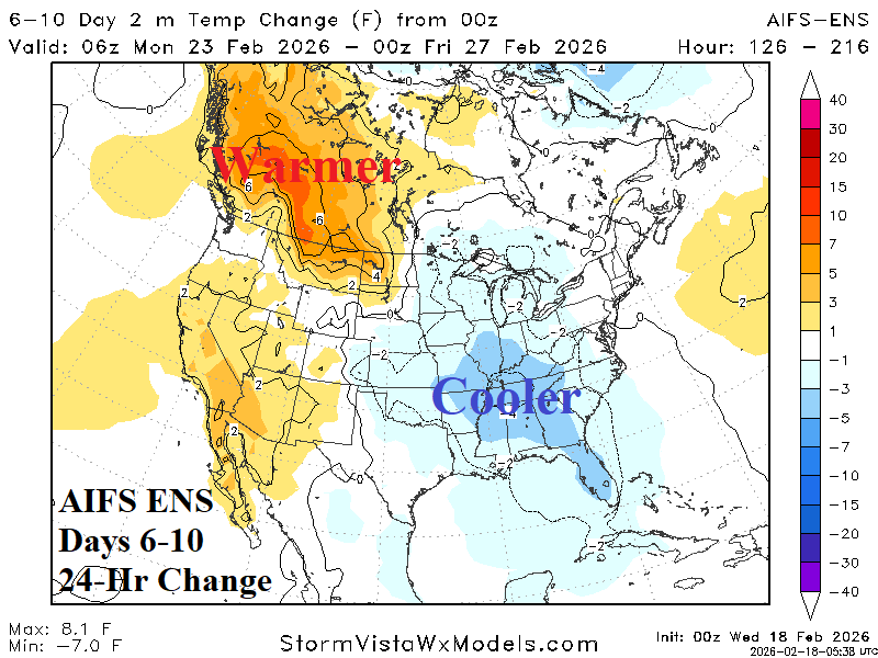 Medium-range 6-10 Day Forecast Valid February 23-27, 2026 (AIFS ENS and 24-hour change)