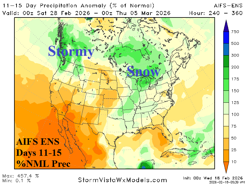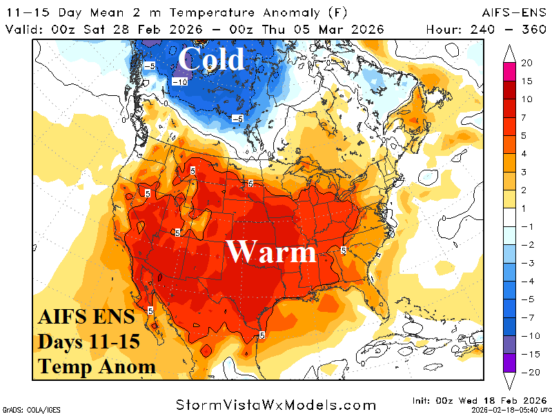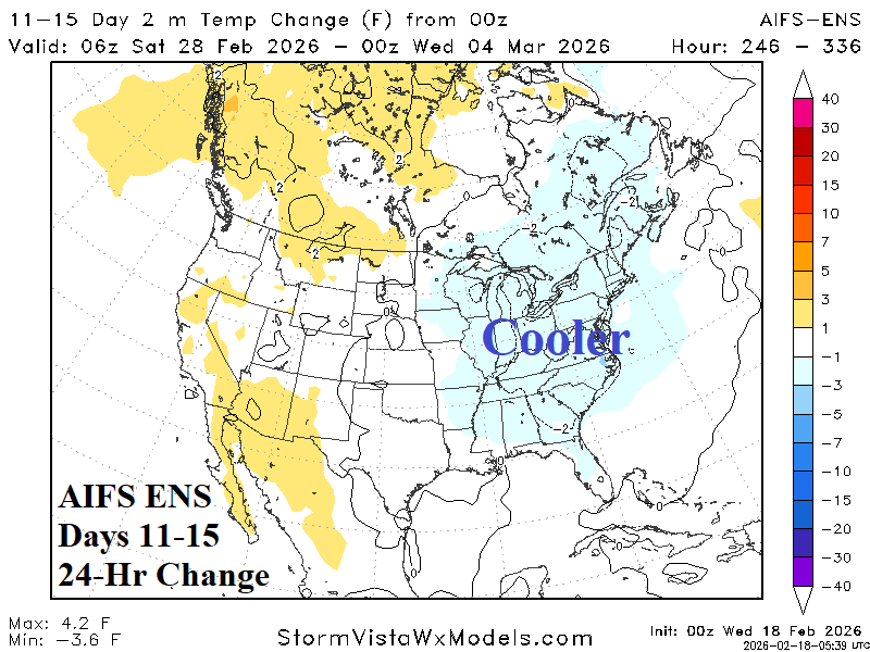 Medium-range 11-15 Day Forecast Valid February 28-March 4, 2026 (AIFS ENS and 24-hour change)
