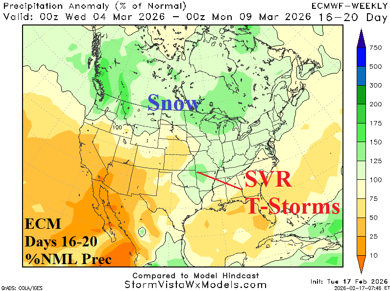 Discussion: The West Coast storm track weakens mid-to-late 6-10-day period and shifts northward to Southwest Canada in the 11-15-day forecast. Ontario turns snowy while wet weather risk increases in the Ohio Valley.