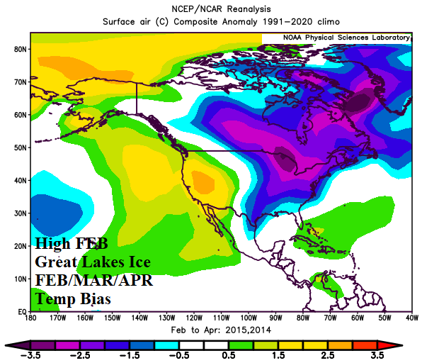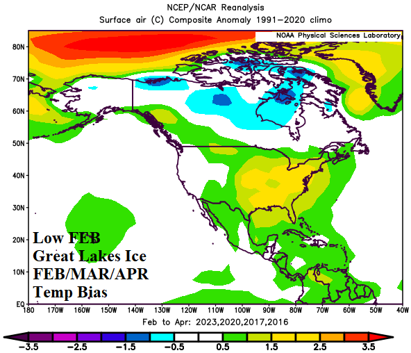 Charts of the day: February 17th Great Lakes ice and FEB/MAR/APR North America temperature bias.