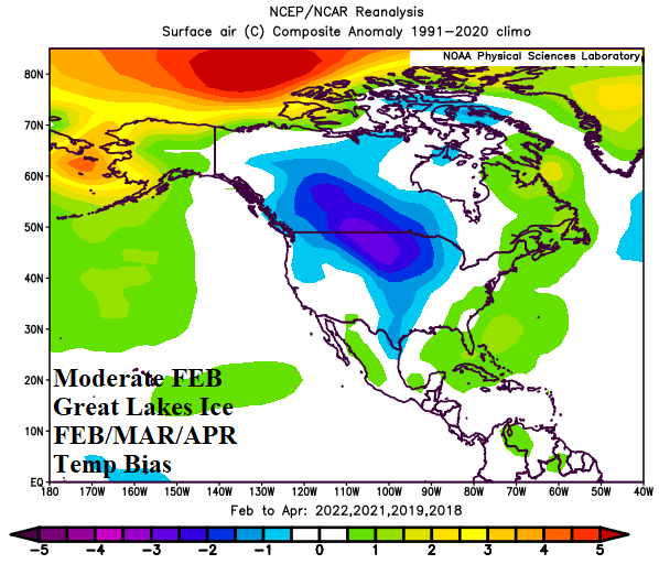 Discussion: As of February 17th, the aerial coverage of ice across the Great Lakes is 47%. Since 2014, the current aerial coverage of Great Lakes ice is about average. When Great Lakes ice has been above average as observed during the 2013-14/2014-15 polar vortex winter seasons, FEB/MAR/APR climate across North America was biased colder than normal. When ice is at moderate levels similar with 2026, a cold bias during FEB/MAR/APR appears to the west of the Great Lakes region. When February aerial coverage of ice is low, the FEB/MAR/APR North America temperature pattern is typically milder than normal. The FEB/MAR/APR temperature patterns are related to the prevailing climate regimes that produced the February Great Lakes ice and what followed.
