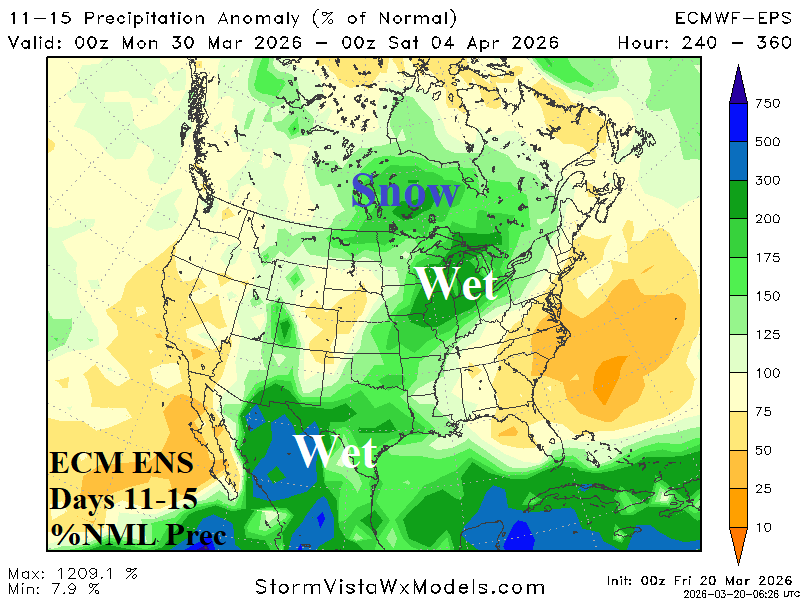 Discussion: Influence of Madden Julian oscillation (MJO) initiates a wet weather pattern change in the 11-15-day period including Texas, East-central U.S., and snowy in Canada. Note the stormy pattern into the Southwest Canadian Coast shuts off in the 11-15-day period.
