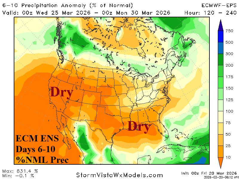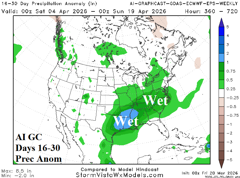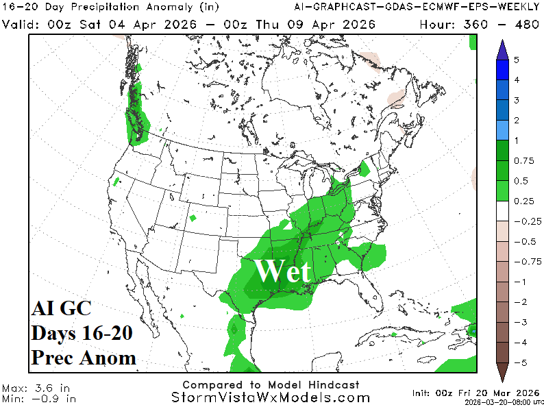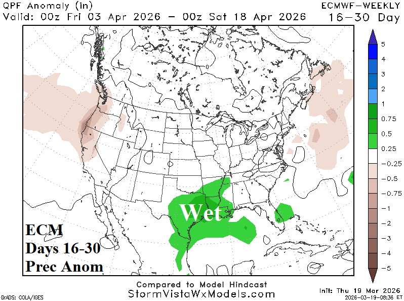 Discussion: Wet weather extends from Texas to the Ohio Valley tempering East U.S. warmth, causing the Southwest to cool, and forcing warmest anomalies into the Northwest States.