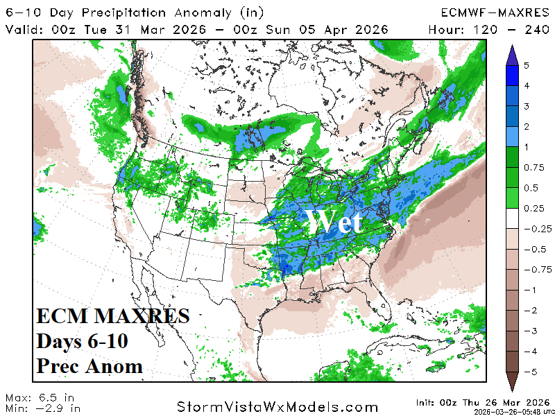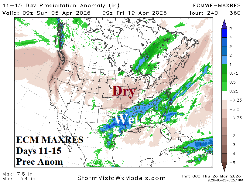 Discussion: ECM MAXRES indicates significant precipitation across the Midwest U.S. in the 6-10-day period. The wet weather extends to the Mid-Atlantic States rather than Texas. In the 11-15-day period, a below average confidence forecast indicates wet weather in Texas to the Carolinas. The lack of MJO/tropical forcing suggests southern latitude rains under-achieve.