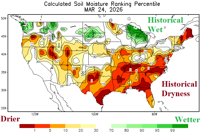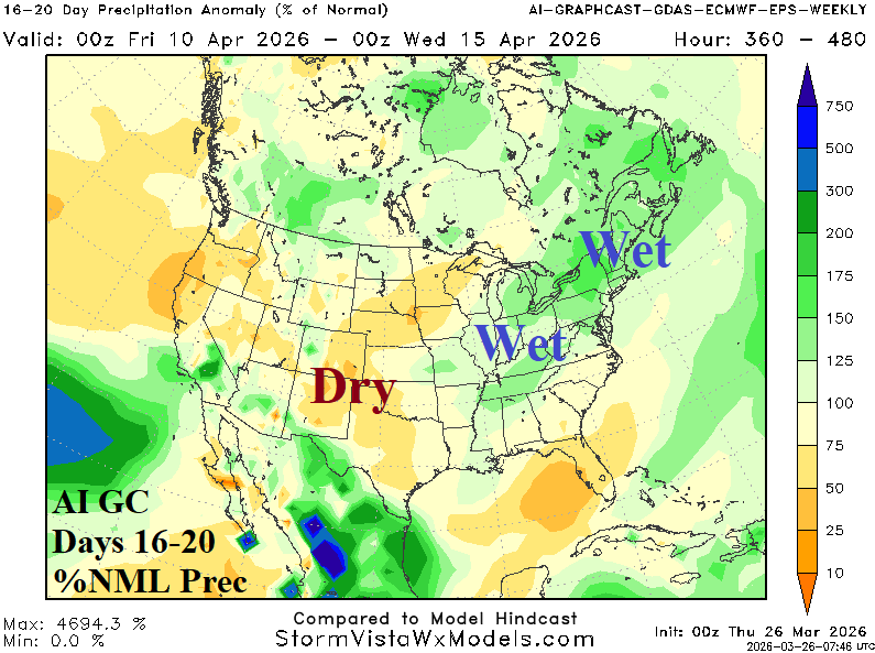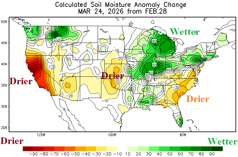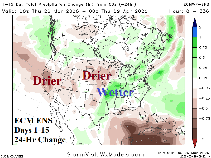 Discussion: About 75% of the U.S. is experiencing dry-to-drought conditions. Impactful wetter trend is occurring in the Great Lakes region and vicinity in March while most of the dry soil zones are missing important precipitation. The 15-day outlook for the U.S. offers significant rainfall in the Mid-south States, more wet weather for the soaking wet Great Lakes region, but is mostly dry and shifting drier for the western Great Plains where drought is forecast to expand during late spring.