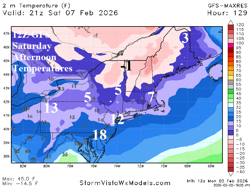 Fig. 1-2: The 12Z GFS projects the coldest day of winter in the Northeast U.S. this Saturday. Afternoon temperatures and wind chill are indicated.
