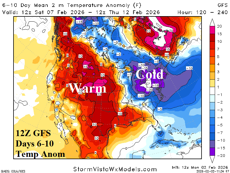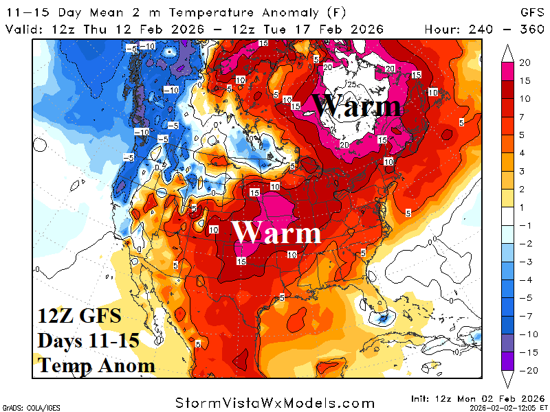 Discussion: The coldest day of winter in the Northeast is projected for Saturday (Fig. 1-2). During the afternoon, the 12Z GFS indicates temperatures not reaching 10F in Boston while wind chill is routinely 10-15F below zero (during the afternoon). The Sunday morning low temperatures are near zero in Boston. The Boston heating degree day for Saturday is probably around 60 with an effective HDD of 70-75. The 12Z GFS identifies the frigid Northeast U.S. 6-10-day forecast while the remainder of the U.S. is warm (Fig. 3) followed by a warm-up into the East in the 11-15-day period (Fig. 4).