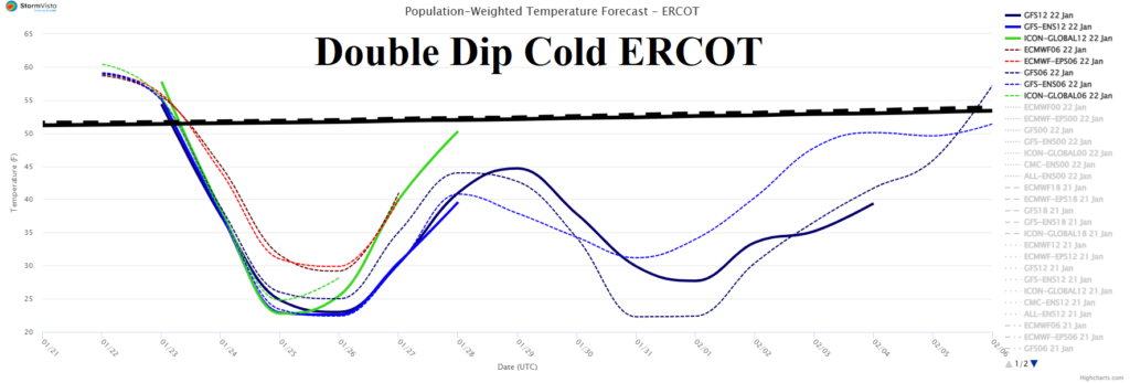 Fig. 1-2: The ERCOT population weight daily temperature average 15-day forecast and a comparison between projected Houston low temperature beginning this weekend into early February compared with other recent cold outbreaks.