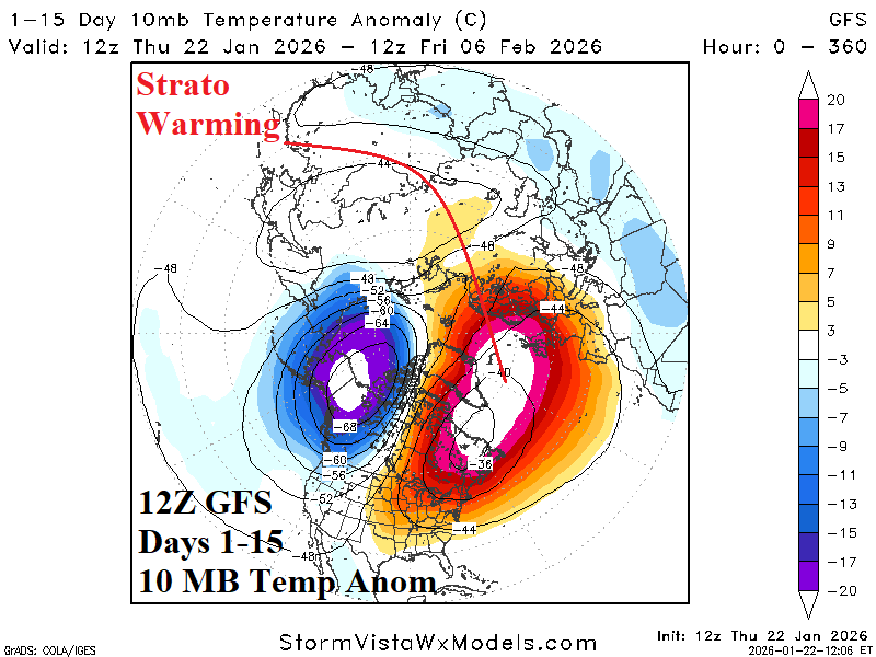Fig. 5-6: The 12Z GFS U.S. 11-15-day temperature anomaly forecast and the 15-day stratospheric warming event across east/northeast North America.