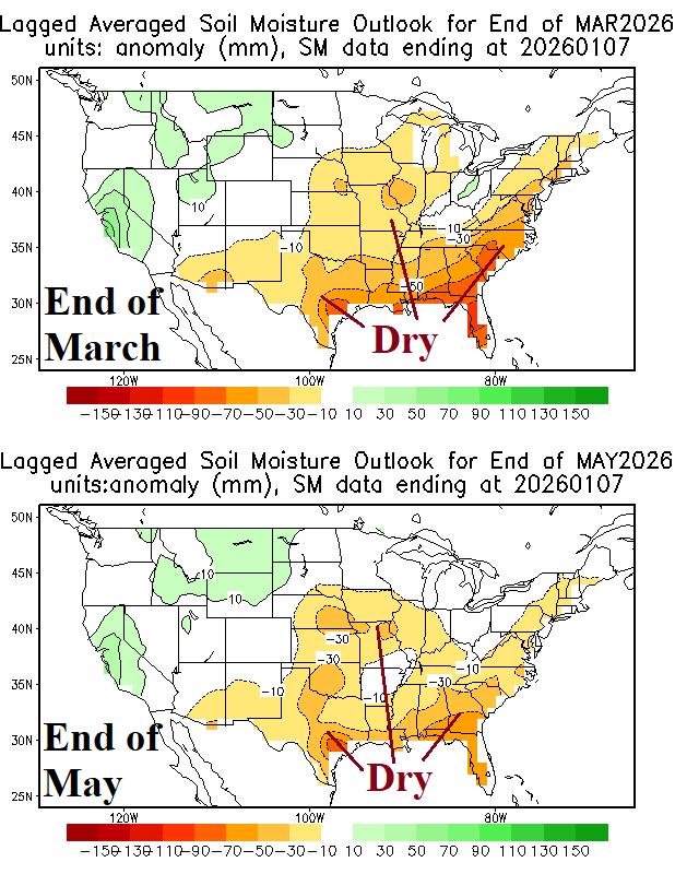 U.S. soil moisture outlooks by SPI and CAS models are agreeable to a potential problem for the southeast quadrant of the U.S. including Texas and northward through the Mid-south and touching parts of the Midwest States (Fig. 8-9). Consensus suggests the most likely drought area for spring is Florida, most of the Southeast U.S., and East/South Texas.