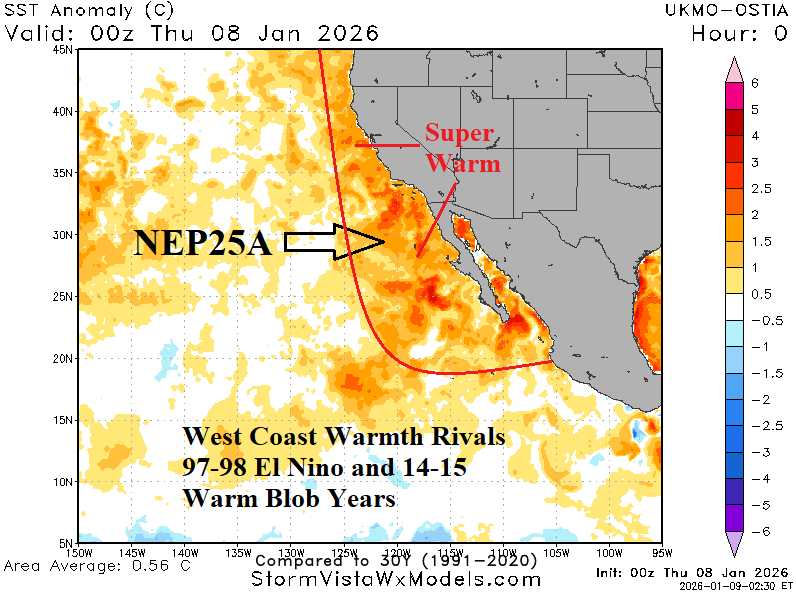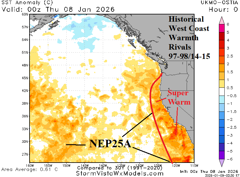 Fig. 3-4: Marine heatwave NEP25A was the strongest on record during SEP-25 in the Northeast Pacific and has shifted to the West Coast in recent weeks.