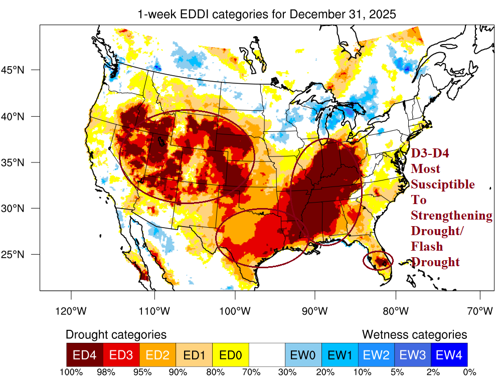 Fig. 7: Latest evaporative drought demand index for the U.S. valid 12/31/25.