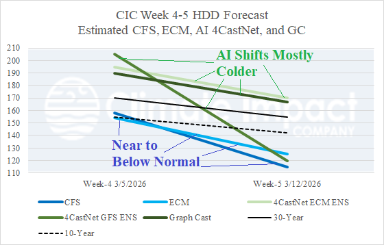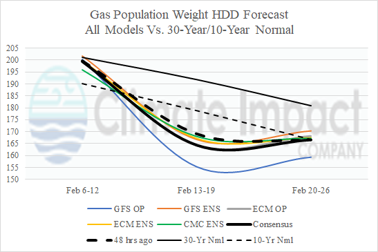 Fig. 9-10: U.S. gas population weight HDD forecast utilizing all models through February and estimated HDD for week 4-5 ahead.
