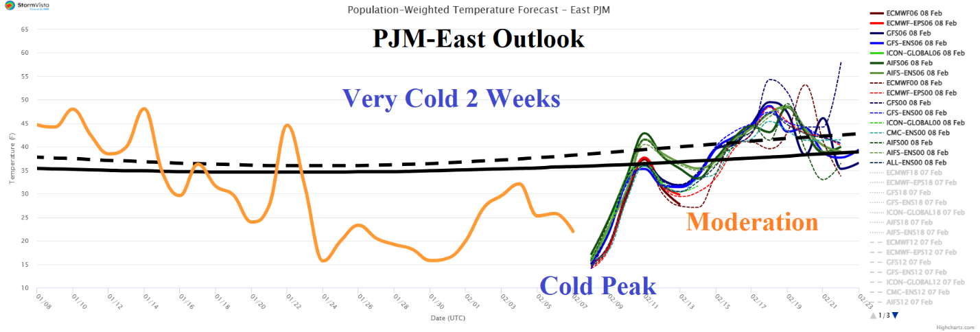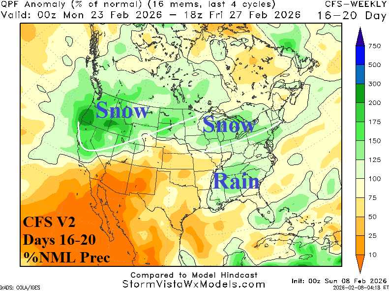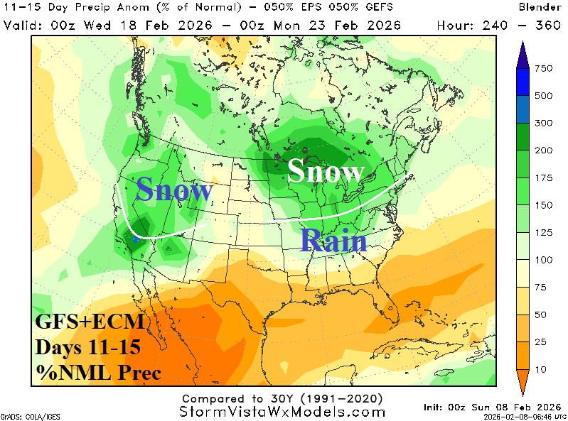 Discussion: A transition into moderate-to-strong negative phase Pacific North America (-PNA) index develops later this week and lasts through the remainder of February (Fig. 1) and may continue in March. The -PNA shifts the focus of U.S. weather hazards from cold to stormy. The pattern evolves in the 6-10-day period as GFS and ECM equally combine to produce a stormy forecast across the West including a large area of snow plus heavy snow in the Upper Midwest U.S. and heavy rain in the Mid-south States (Fig. 2). In the 11-15-day period, storminess including heavy snow continues across the West with heavy snow in Ontario/Great Lakes/New England and heavy rain in the Tennessee Valley (Fig. 3). The stormy pattern lingers in the extended range in the Northwest U.S., Midwest, and Southeast States (Fig. 4). ECM and CFS V2 maintain a -PNA pattern during March (Fig. 5-6) supporting potentially additional heavy precipitation in the Mid-south U.S. (and vicinity). The last of the extreme cold to start the week in the Northeast U.S. where daily records are possible in both the PJM-East/NEPOOL electric reliability zones (Fig. 7-8). Moderation follows for mid-to-late February although deepening Northern U.S. snow cover may help to regenerate cold later in the month. The U.S. population weight HDD forecast identifies the national decline in heating demand next week potentially returning to near or colder than normal late FEB/early MAR (Fig. 9-10).