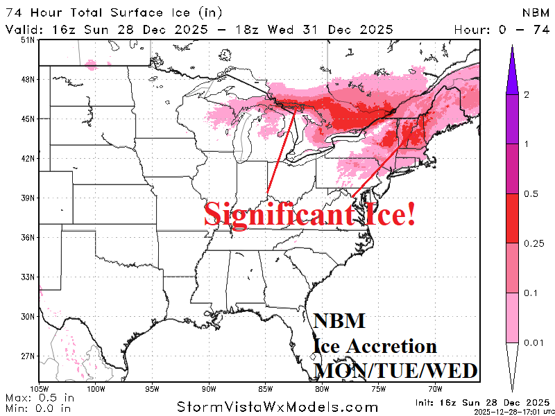 Fig. 7-8: The NBM snowfall and ice accretion forecast across the East U.S. for early week.