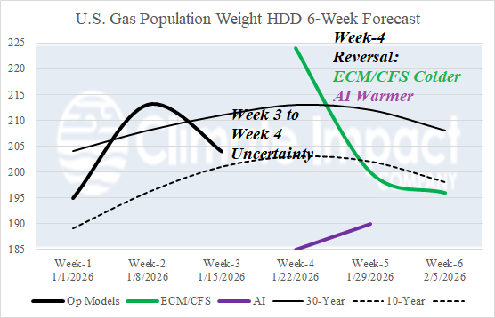 Fig. 2-3: The weekend U.S. gas population weight HDD forecast utilizing all models trend colder through mid-January while CFS/ECM and AI week 4-6 (HDD) estimates reverse as AI shifts warmer.