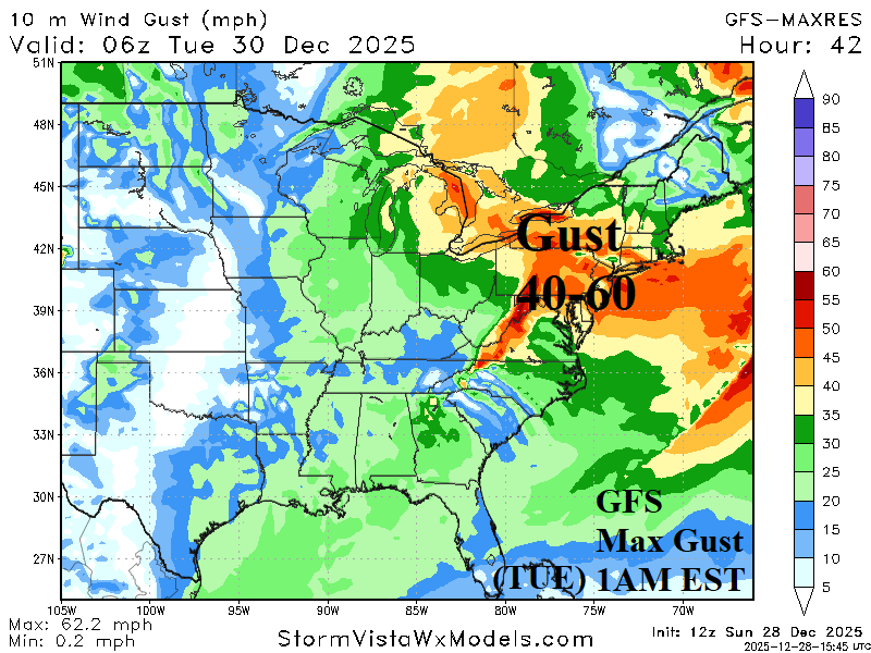 Fig. 5-6: 12Z GFS maximum wind gusts in the Ohio Valley for tonight and Northeast U.S. tomorrow night.