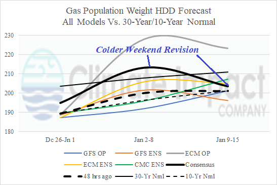Fig. 2-3: The weekend U.S. gas population weight HDD forecast utilizing all models trend colder through mid-January while CFS/ECM and AI week 4-6 (HDD) estimates reverse as AI shifts warmer.