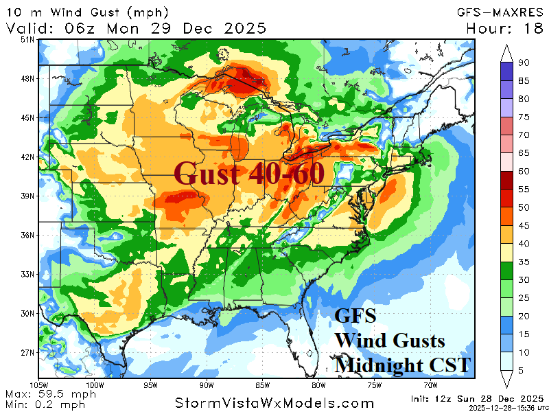Fig. 5-6: 12Z GFS maximum wind gusts in the Ohio Valley for tonight and Northeast U.S. tomorrow night.