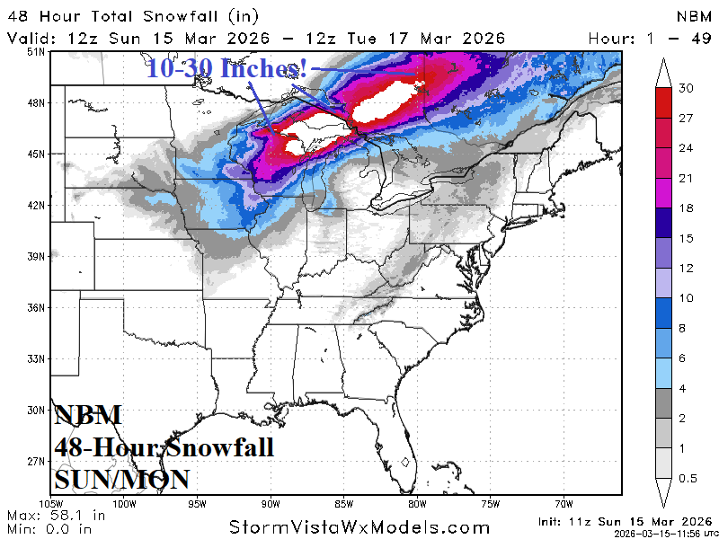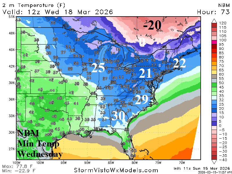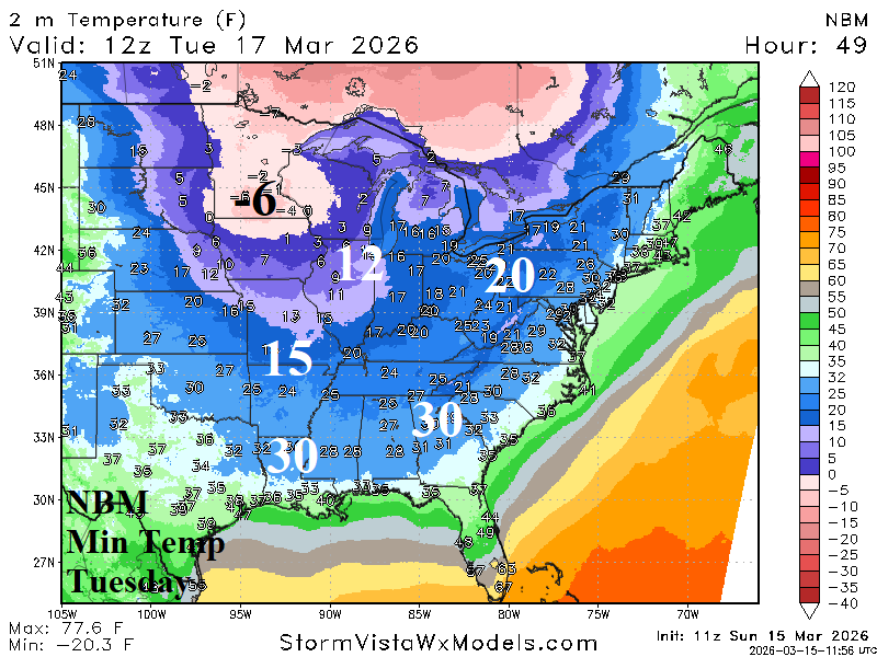 The 48-hour snowfall forecast across the Upper Midwest U.S. is impressive featuring widespread 10-30 inches of snow, most occurring with high wind, and near zero visibility (Fig. 4). The following cold causes morning low temperatures to plummet to -6F in Minneapolis, low teens in Chicago, and 30F in Atlanta Tuesday morning with significant wind chill (Fig. 5). The cold morning low temperatures sweep across the Northeast/East U.S. Wednesday morning (Fig. 6).