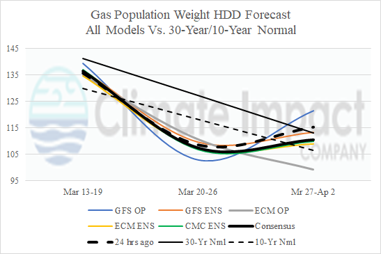 Fig. 7: U.S. gas population weight HDD forecast utilizing all models, their consensus, and comparison with 48 hours ago and 30-year/10-year climatology.