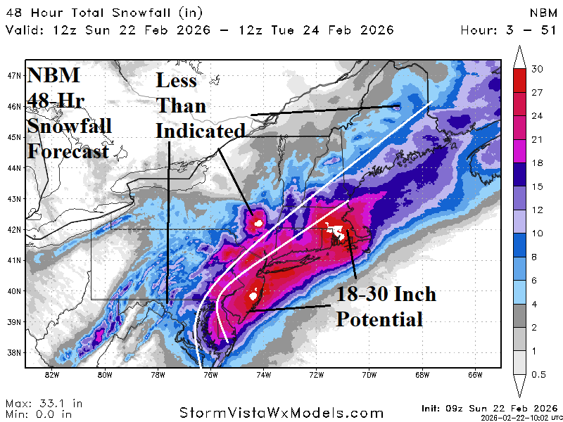 Fig. 2: NBM 48-hour snowfall forecast for the Northeast Corridor.