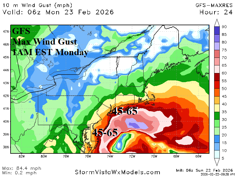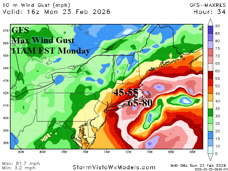 Fig. 4: The GFS max wind gusts in the coastal New England region tomorrow morning.