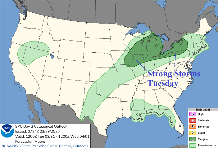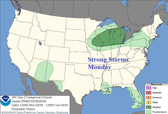 Fig. 7-8: NOAA/SPC outlook for strong thunderstorms stretched across the Great Lakes region tomorrow and Tuesday.