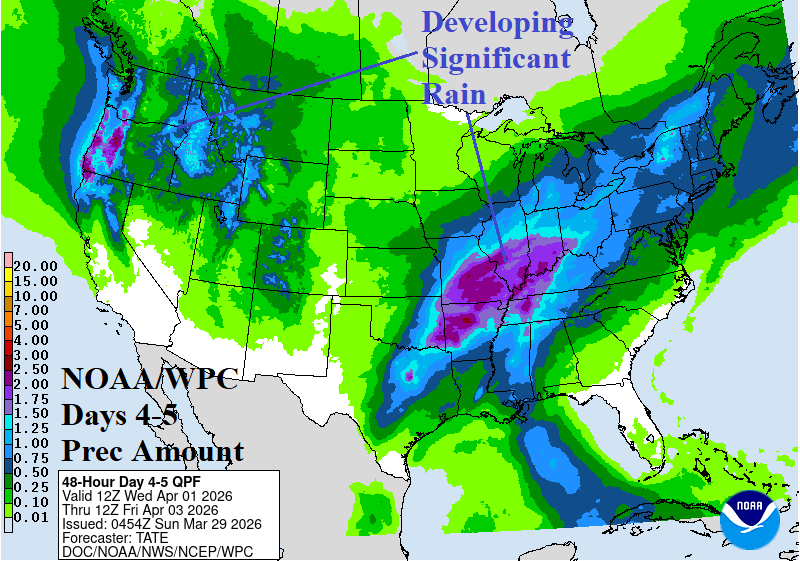 Short-term issues include an unusual outbreak of strong thunderstorms featuring isolated hail and damaging wind across the same region on consecutive days (Fig. 7-8). A slow-moving cold front is responsible for the storms. The front shifts southward and stalls later this week and weekend causing an evolving wet pattern centered on the Mid-south U.S. (Fig. 9-10).