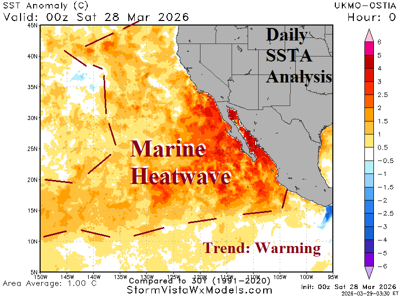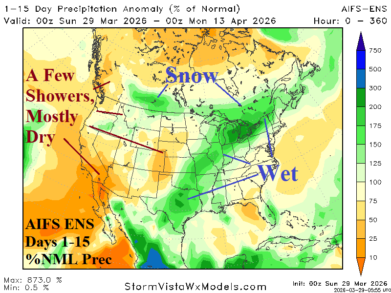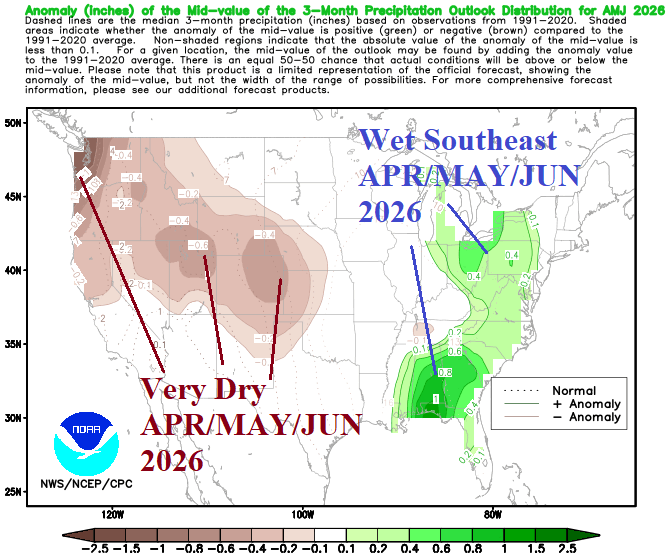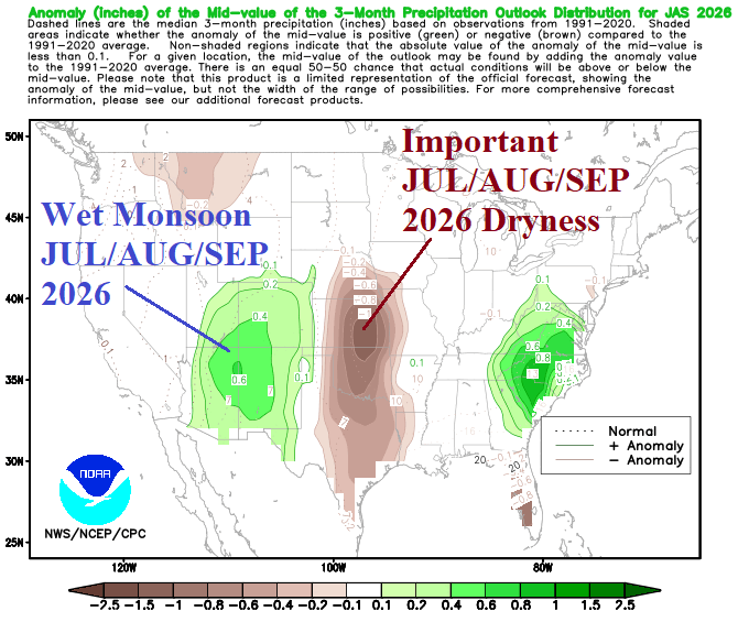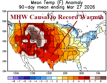 Discussion: Record low snowpack provides much below normal snowmelt and river inflows sustaining and intensifying a water supply drought across much of the West U.S. (Fig. 1). The intensified snow drought of winter 2026-27 and the attendant record warm temperatures (Fig. 2) was inspired by persistent intense high pressure ridging in the upper atmosphere across and downwind the highest aerial coverage of a marine heatwave (MHW) on record in the Northeast Pacific (Fig. 3). A wetter pattern in the U.S. is forecast for much of April. However, as indicated by the 15-day AIFS ENS percent of normal precipitation forecast (Fig. 4), a few showers in the Columbia/Great Basin surrounded by sustained dry weather for the remainder of the West is not helpful while most of the rain is in the East-central U.S. to Texas stretch. NOAA/CPC long-lead precipitation probability forecasts indicate the dry problem in the West accelerates during APR/MAY/JUN 2026 (Fig. 5). However, due to developing El Nino influences including effects on climate by the previously described MHW, a wet Southwest Monsoon is expected for JUL/AUG/SEP 2026 (Fig. 6). Given inclusion of the MHW influences, the Southwest U.S. rainfall could be prohibitive. Consequently, the 4-Corners Region drought ends during late warm season while continuing farther west in California and northward for the Northwest U.S. and Southwest Canada. Note that significant dryness appears in the Central Great Plains to Texas during Q3/2026.