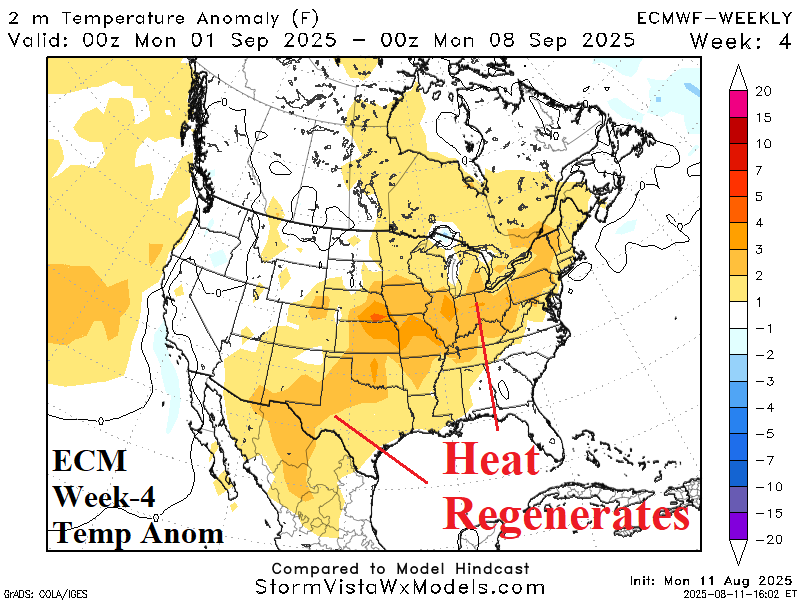 Discussion: ECM rewarms the East; other operational and AI models keep the East temperate. In September, widespread anomalous warmth is forecast to regenerate by climate outlooks. Nationally, the pattern is dry except the Coastal Northwest.