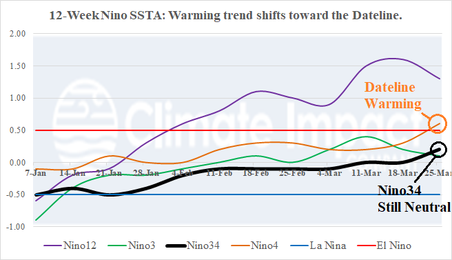 Discussion: Last week, the Nino4 SSTA warmed too above the El Nino threshold (Fig. 1). The Nino4 region is located on either side of the Dateline and the warming in this region is a southwestward expansion of surface warming associated with an intense marine heatwave off the West Coast of North America (Fig. 2). NOAA reported a multivariate ENSO index for JAN/FEB of -0.9 which is slightly stronger than the DEC/JAN value. Indicated is that as of early March, the global atmosphere was locked in moderate La Nina phase. However, the equatorial East Pacific Ocean has warmed slightly in March and recently southern oscillation index (SOI) has shown an El Nino-like negative phase tendency (Fig. 3). The MEI should ease back to -0.5 or neutral when the FEB/MAR data is issued. The upper ocean heat remains immense. In fact, some intensification has been observed near the Dateline (Fig. 4). The strong subsurface warming has caused dynamic models to project a possible record strength El Nino for later this year (Fig. 5).