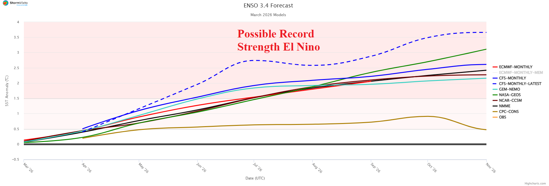 Fig. 5: The Nino34 SSTA forecast for 2026 reveals potential for a record strength El Nino.