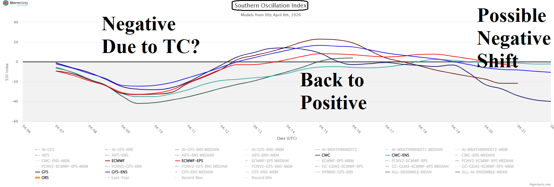 Fig. 3: Persistent negative southern oscillation index is required to generate an El Nino climate. The short-term -SOI may be due to tropical cyclone activity north of Australia. +SOI is forecast to redevelop next week.