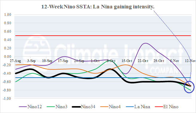 Fig. 1: The 12-week Nino SSTA trend indicating all within the La Nina threshold during the past week.