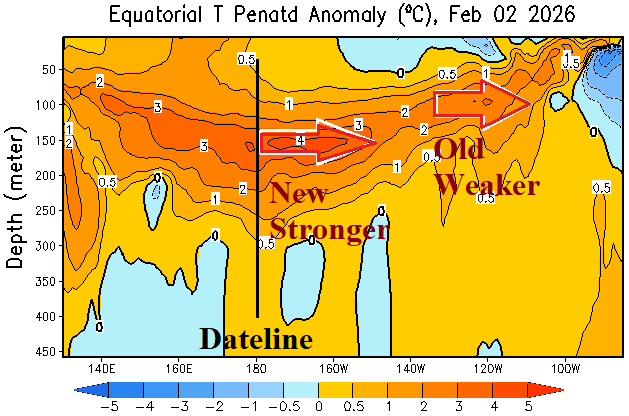 Fig. 1: A second Kelvinn Wave has developed in the equatorial Pacific subsurface.