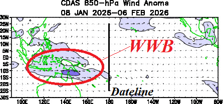 Right now, the leaning-edge of a Kelvin Wave shifting through the eastern equatorial Pacific during the past few weeks has weakened just before reaching the northwest coast of South America (Fig. 1). A new Kelvin Wave has strengthened and shifted just east of the Dateline. A westerly wind burst associated with the new Kelvin Wave is present just west of the Dateline (Fig. 2).
