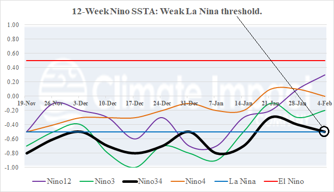 Fig. 3: The 12-week Nino SSTA monitor indicates the Nino34 SSTA has returned to the La Nina threshold.