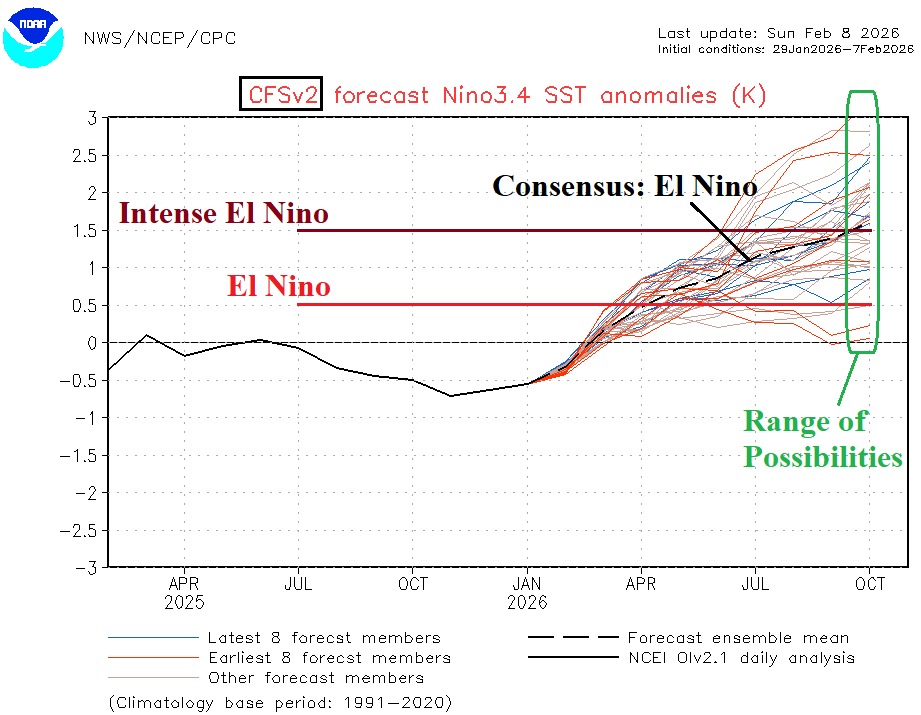 At the surface, Nino SSTA are slow to respond to the subsurface warming. In fact, during the past week, the Nino34 SSTA returned to the -0.5C La Nina threshold (Fig. 3). Also notable, the daily southern oscillation index (SOI) is very supportive of a lingering La Nina climate during early February continuing a similar observation by multi-variate ENSO index (MEI). The subsurface oceanic character of the equatorial Pacific is very supportive of dissipating La Nina and encouraging El Nino development while surface conditions stubbornly hang onto La Nina (Fig. 4-5). The conflicting signals are typical of this time of year and represented by the ENSO prediction barrier as FEB/MAR/APR historically yield very low skill in forecasting ENSO phase. Nevertheless, the subsurface warm water signals support an aggressive NCEP CFS V2 El Nino forecast for 2026 (Fig. 6).