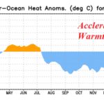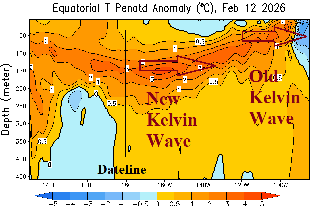Fig. 1-2: A second Kelvinn Wave has developed in the equatorial Pacific subsurface. Note the dramatic warming during the past 2 months of the eastern equatorial Pacific Ocean.